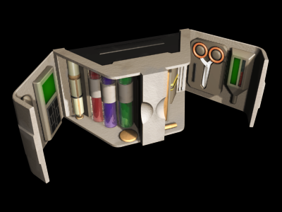 Regardless of size, all kits contain essential generic items such as hyposprays, laser scalpels, spray-bandages, bone stabilizers, bacta patches, arrays of medications and a portable defibrillator. Each unit typically also carries a sample analyzer and handheld medisensor to help the user determine the best course of treatment. The less expensive medikit scanners are simple in design and programming and usually only house the treatment directions for one species at a time. For these models, programming packages are sold at additional cost, although a sentient could still only be able to treat one species at a time.