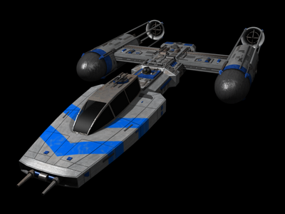 The most versatile of all Rebel starfighters, the Y-Wing is capable of handling virtually every mission with only slight modifications. Specifically the inclusion of Ion cannons in its arsenal make it a popular starfighter amongst pirates. Like the famous TIE fighter, the Y Wing is powered by a twin Ion engine, but unlike the TIE this ship has both engines away from the main hull, giving it the characteristic Y shape when viewed from above or below. A drawback to this design has proven to be the fact that it now leaves the Y wings power couplings in an exposed position, making them a preferred target in dogfights. This variation of the Y wing designated the BTL-S3 is a two man variant, usually a pilot and a gunner. It has superior shields to its sister ship, the BTL-A4 Longprobe because of the inclusion of an extra Novaldex power generator. The extra power is also needed for the weapons. The proton torpedo magazine, located just under the passenger/gunner seat was removed for the BTL-A4 model to make room for the extra sensor package.